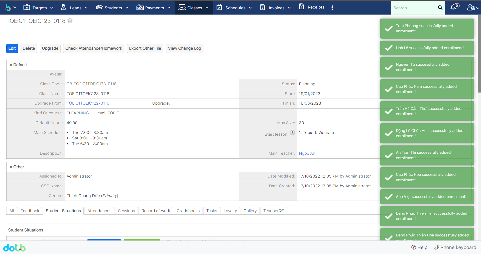 - Thông tin, sỉ số, ngày bắt đầu và kết thúc của lớp được Upgrade.